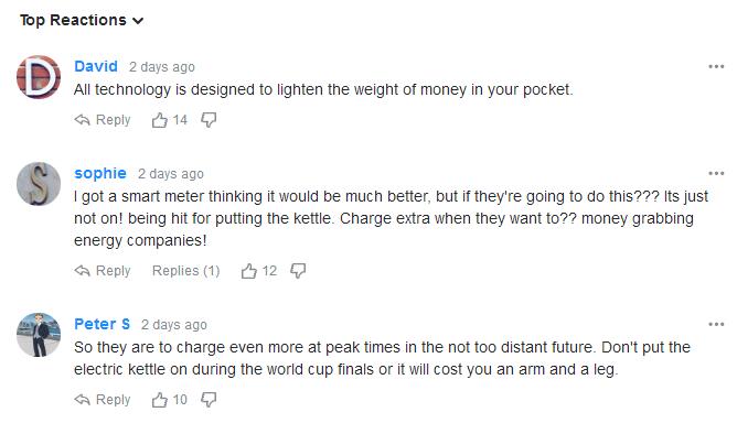 網(wǎng)友Peter S:因此,在不太遙遠的將來,他們將在高峰時期收取更多的費用。在世界杯決賽中不要把電水壺放在上面,否則你要費一大筆錢。